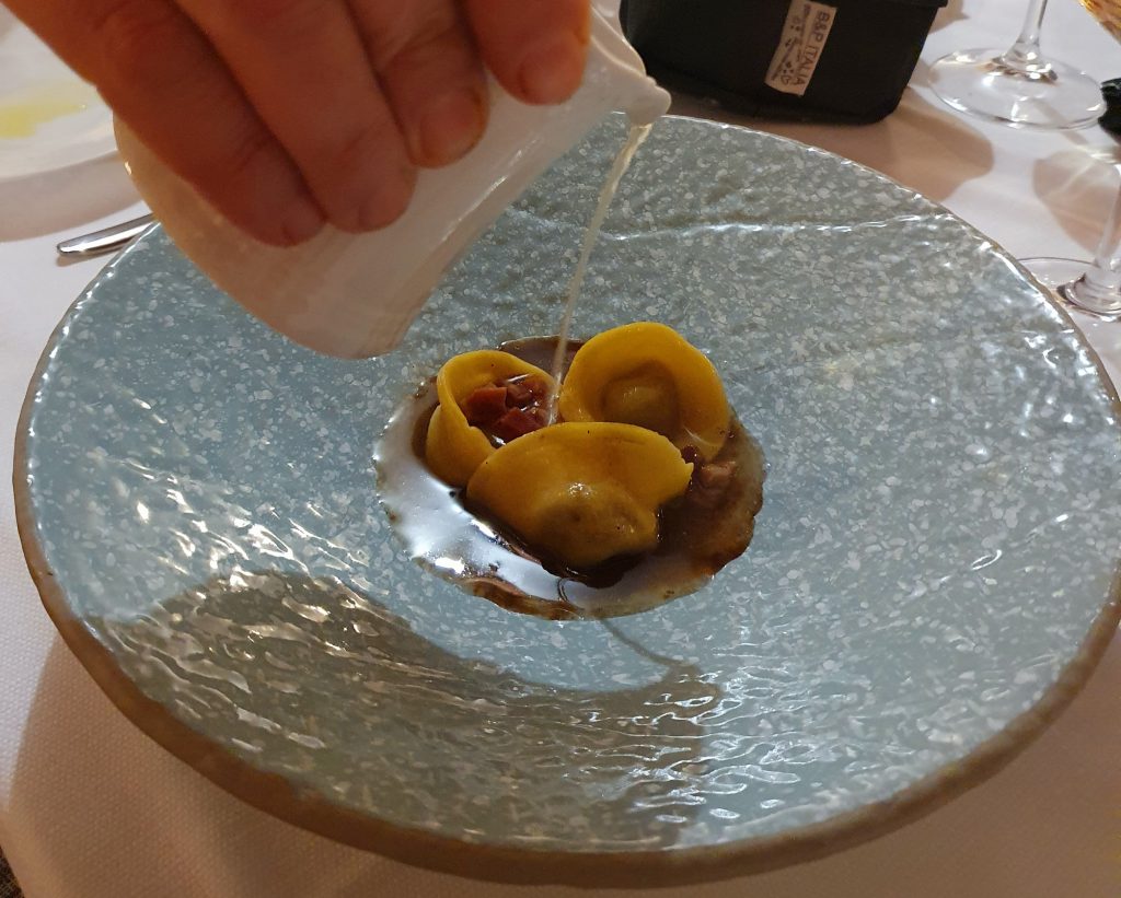 Dopo un’entrée di Tataki di chianina ripiena di stracchino e tartufo, tra gli antipasti si possono trovare si possono trovare la Ciabatta di Grano arso cotta al forno con salsiccia di Norcia, stracchino e peperoni e l’Uovo a 60° con bottarga di alalunga fatta in casa. Un tripudio di gusto così come il Soufflè ai carciofi e pecorino, soffice e saporito.