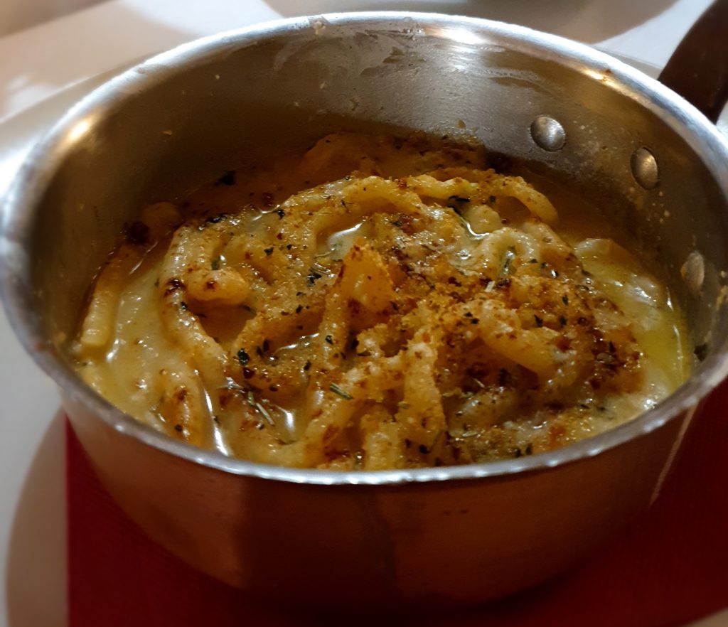 Tra i primi, straordinari i Ravioli di piccione fatti a mano e cotti in brodo di verdure bruciate. Vero e proprio comfort food, succulento e ben bilanciato nei sapori. Imperdibili anche i Pici preparati con farina tipo 1 e integrale del Mulino Giuliotti e conditi con burro salato, ceci e rosmarino.