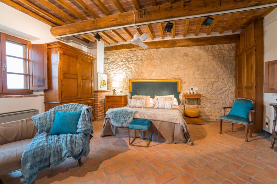 All’interno della struttura, una grande sala ristorante, arredata con tavoli e mobili in legno e resa speciale da un immenso camino a legna, e ben 18 stanze da letto, tutte personalizzate, tra suite con vasca idromassaggio e camino e matrimoniali standard, e affacciate sulla splendida piscina con vista sul Monte Amiata.