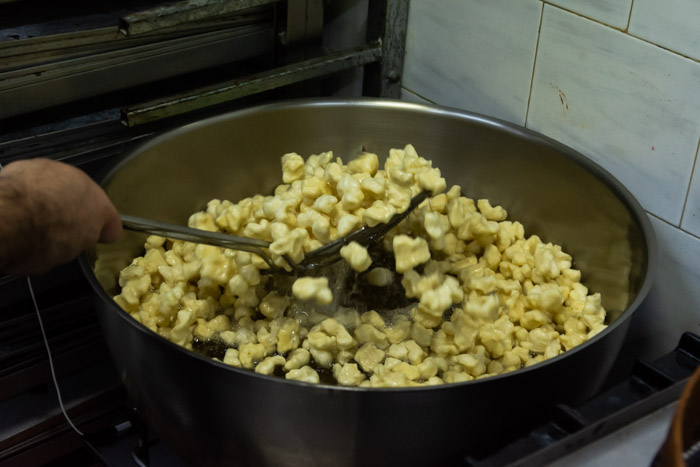 Entrando nel laboratorio della Pasticceria Vinci di Messina si viene pervasi da un profumo inebriante di dolcezza, qui preparano circa 300 kg di Pignolata nel periodo di Carnevale.