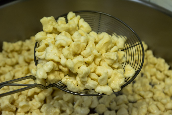 Friggere gli gnocchetti nello strutto, saranno pronti quando si apriranno come pop corn.