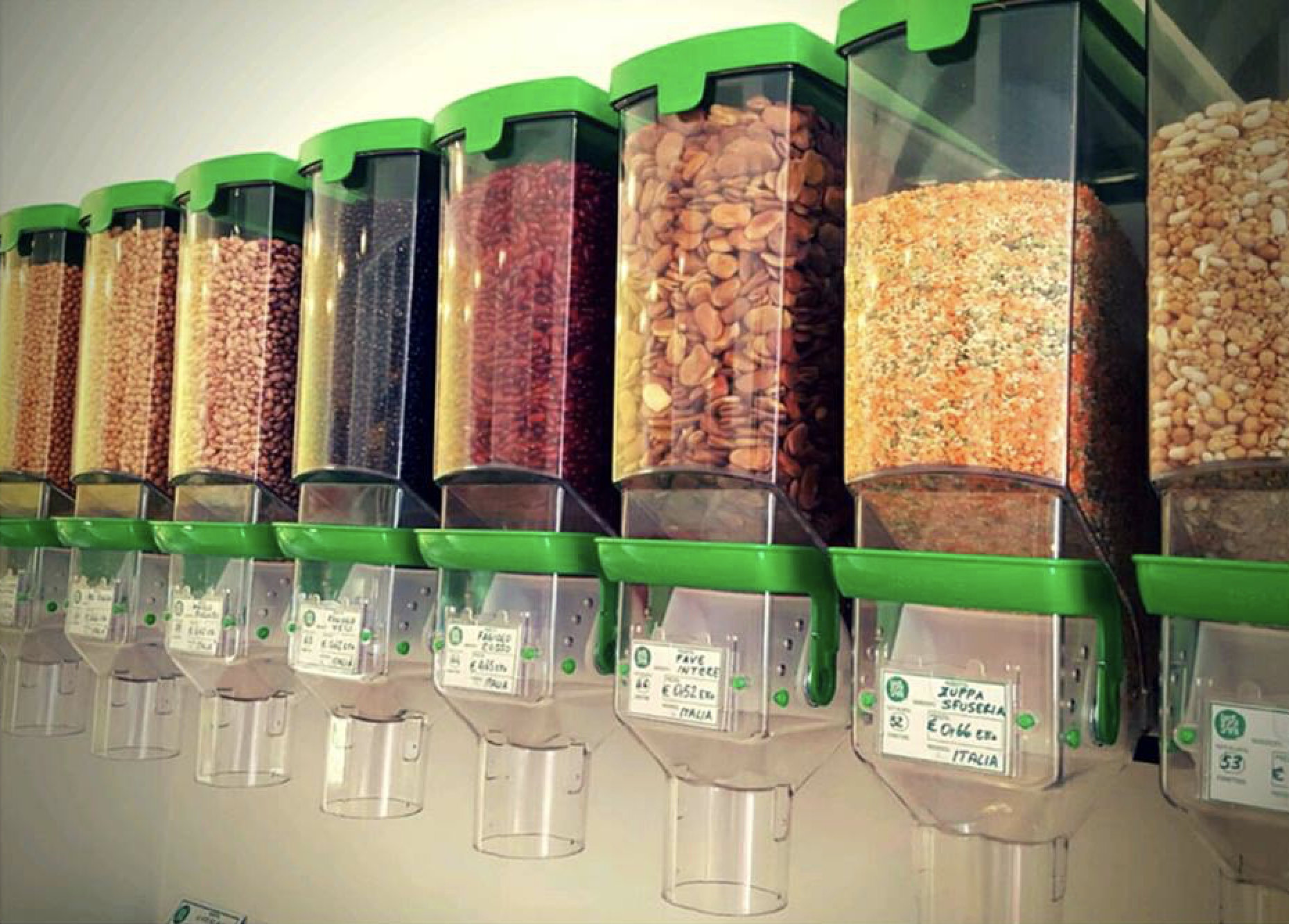 Pasta, riso, legumi, frutta secca, spezie ma anche uova, biscotti e caffè si trovano in contenitori e possono essere comprati sfusi. Attaccati al muro del locale ci sono i rubinetti per acquistare alla spina prodotti come vino, olio e detersivi.