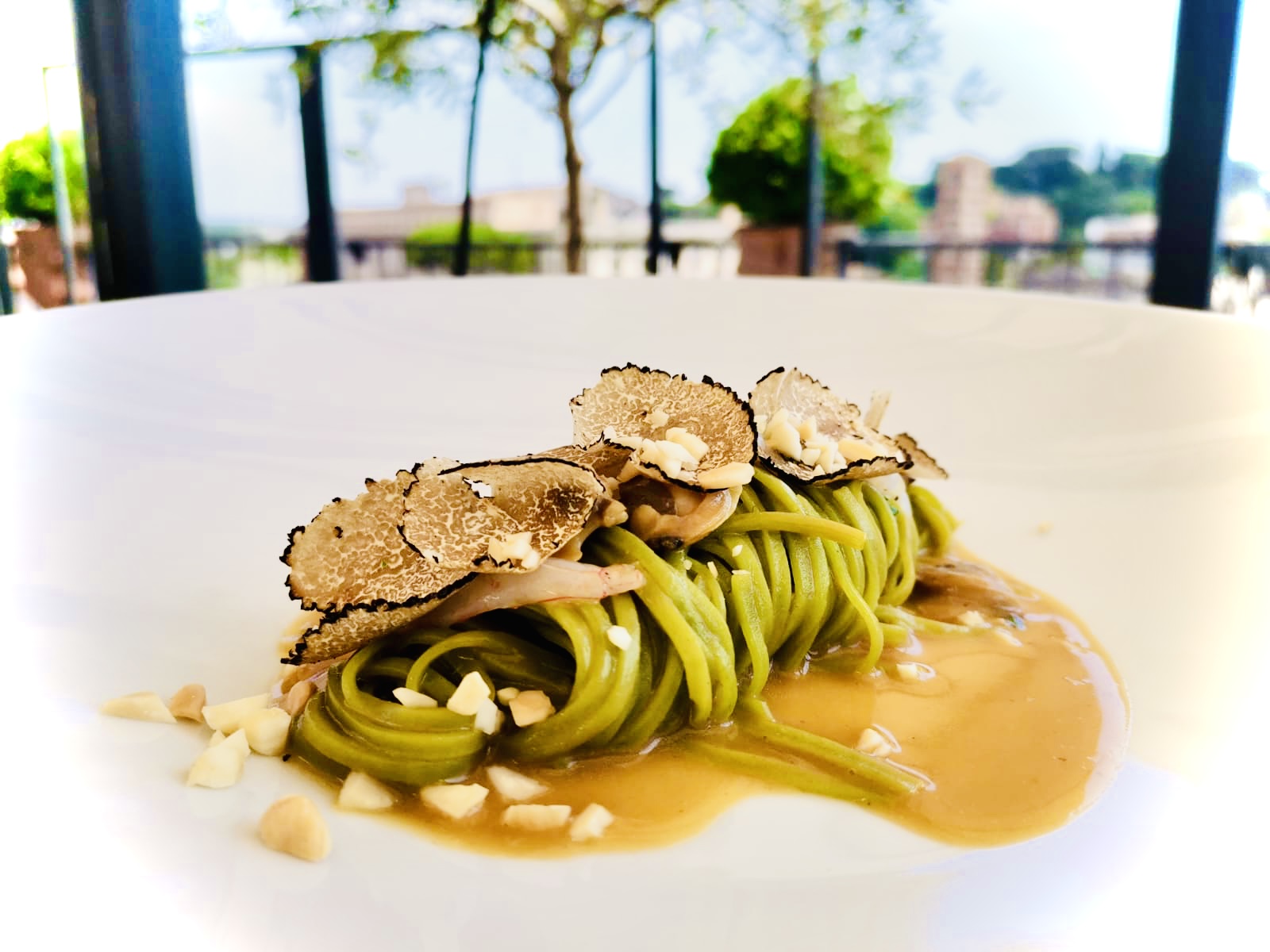 “Nei tagliolini alle erbe, lupini, gamberi bianchi, mandorle e tartufo nero” (in foto di copertina) l’utilizzo delle erbe nella pasta dei tagliolini crea una base nuova per l’esaltazione dei protagonisti blasonati di mare e di terra, la vera nota distintiva è dietro le quinte, nella dolcezza complessiva del piatto, una rotondità resa possibile da una percentuale di brodo di pollo in fase di mantecatura. Una giusta e poco frequentata illuminazione.