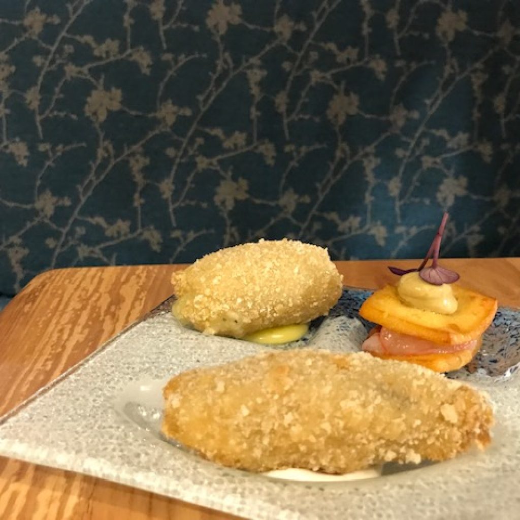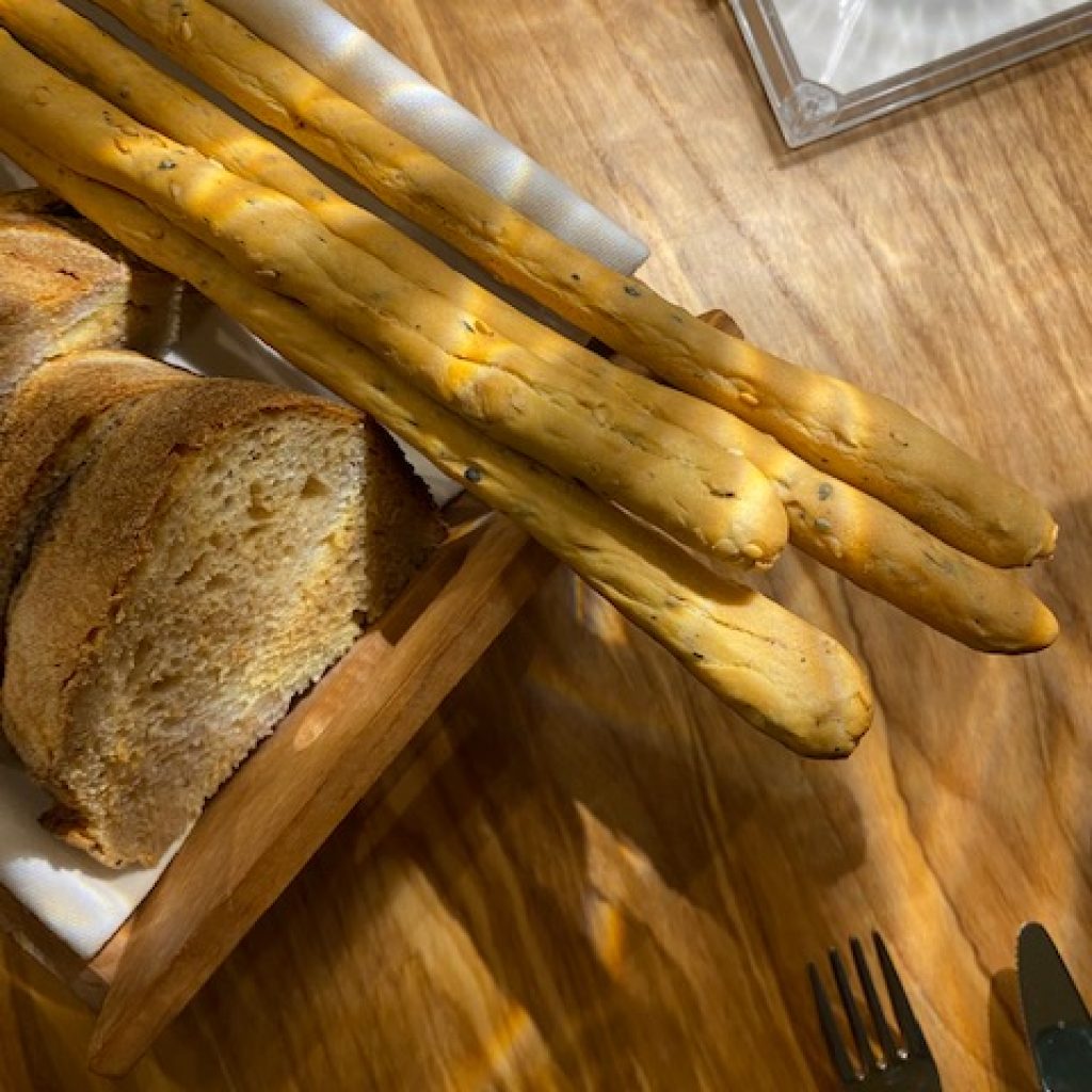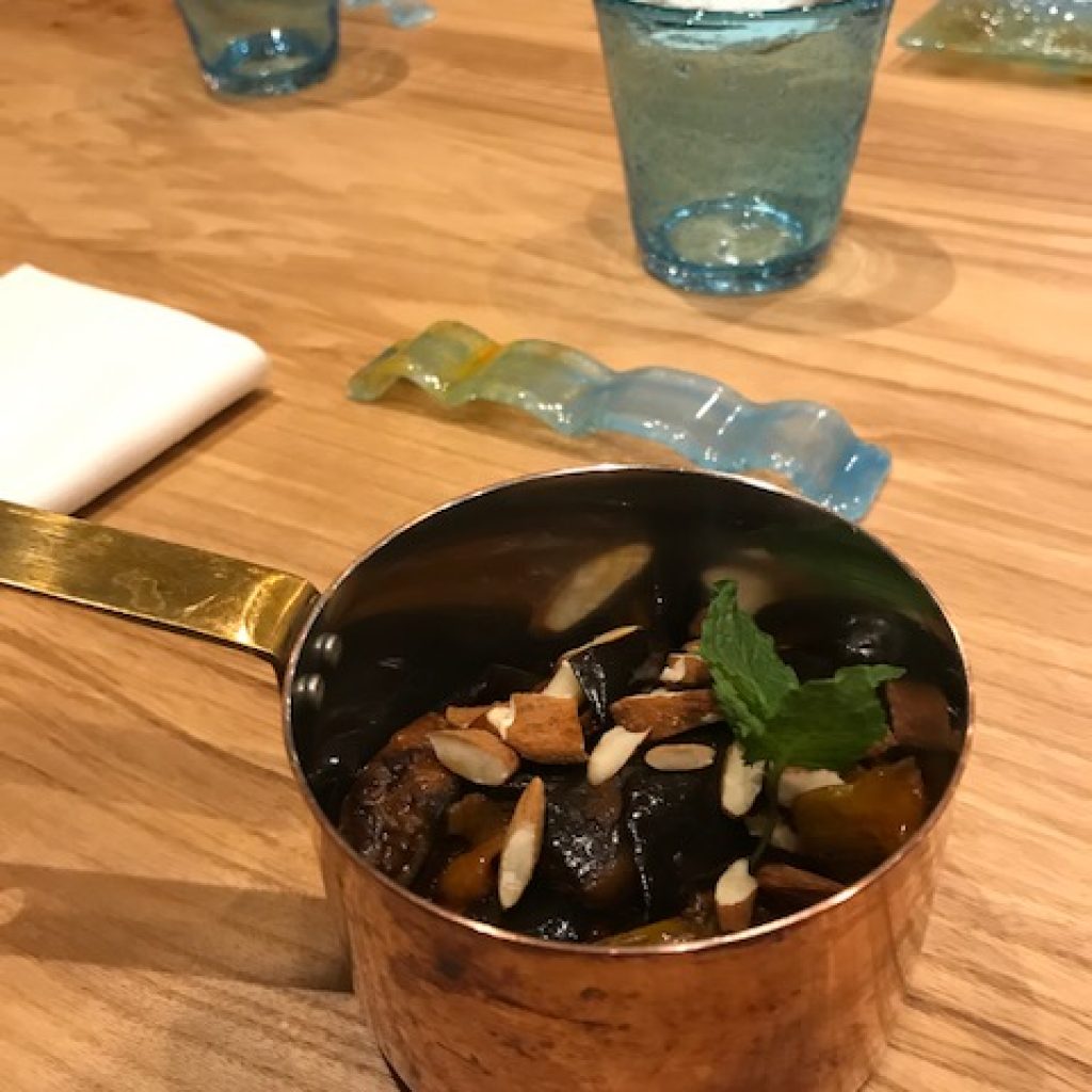 Il benvenuto iniziale non potrà che farvi sorridere. Un piattino che accoglie Crocchè di patate e prezzemolo con salsa al limone, un Sandwich di panella con gambero e guacamole, il Beccafico alla catanese con salsa di acciughe. Vi verrà portato, appena seduti, anche un cestino del pane fatto in casa che comprende Il moro, panino a base di farina di Tumminia, con semi di girasole e finocchietto selvatico, Pane rustico semintegrale con russello e grissini con sesamo nero e sfogliati al burro. Da accompagnare rigorosamente con una bollicine fresca, se possibile siciliana. Si continua con la Caponatina barocca a base di Melanzana, sedano, carota, capperi olive e l’immancabile sentore agrodolce dato dal bilanciamento di aceto, sale e zucchero con un tocco astringente finale di cacao e la croccantezza delle mandorle.