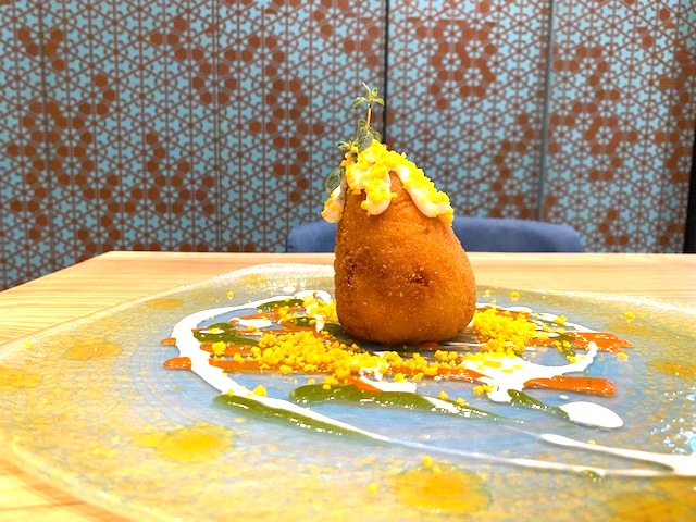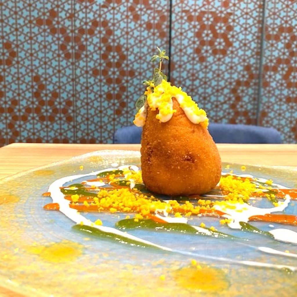 Omaggio all’arancino e a Milano. Uno dei piatti da non perdere da Terrammare è il Risotto in Sicilia. L’arancino composta da riso Carnaroli riserva con burro e Parmigiano, ripieno di sugo di manzo, maiale e vitello (con la carne tagliata a pezzi grossi), arricchita con uovo sodo come si fa nella zona di Scicli. Il cuore è golosa provola fondente fusa.