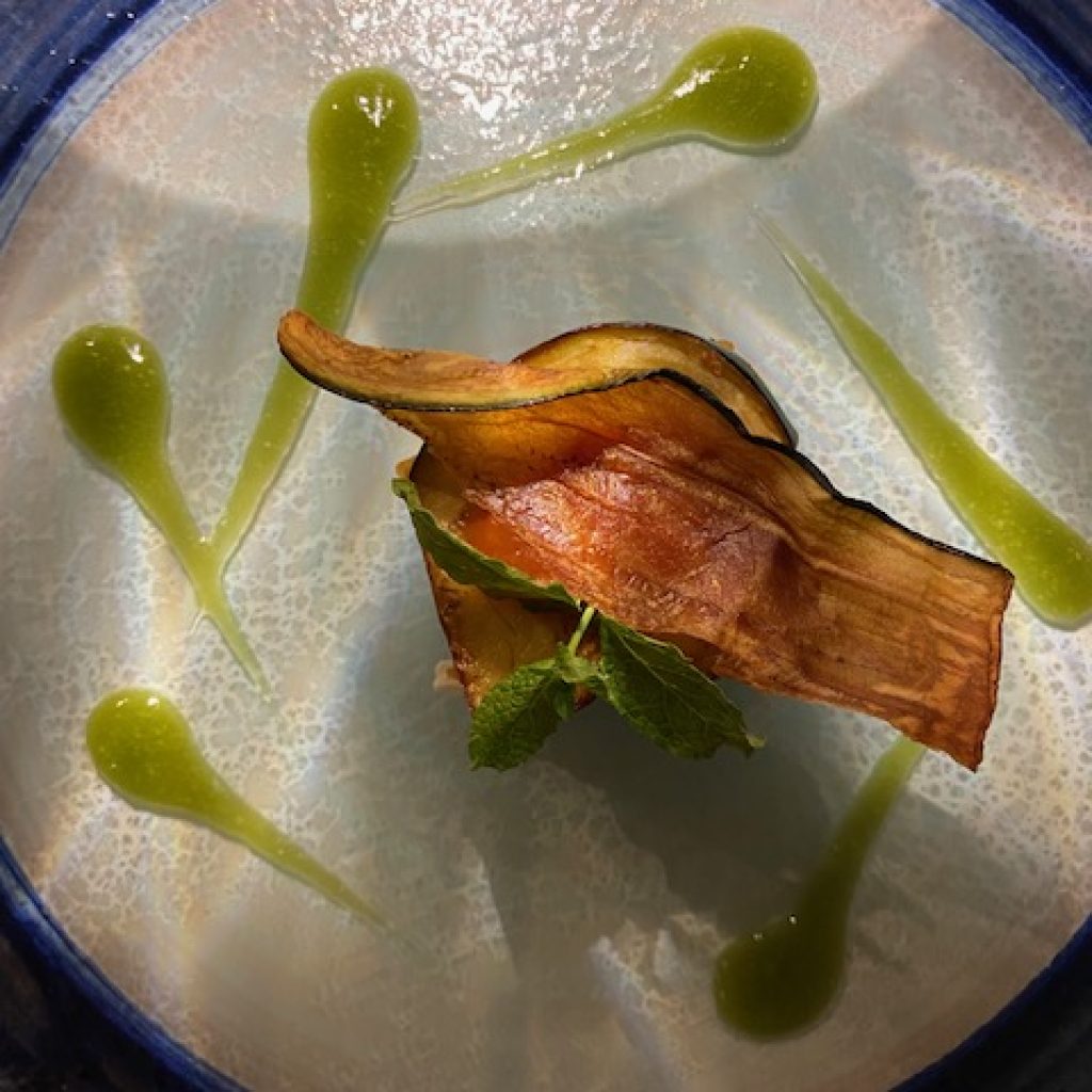 Strati melanzana fritta a fette con provola dolce e affumicata per una nota di terra, salsa al basilico, spuma di ragusano e melanzana fritta. Servono poche descrizione per garantire la bontà di un piatto siciliano iconico, qui ben eseguito dallo chef con tecniche che rendono il boccino golose e leggero allo stesso tempo.
