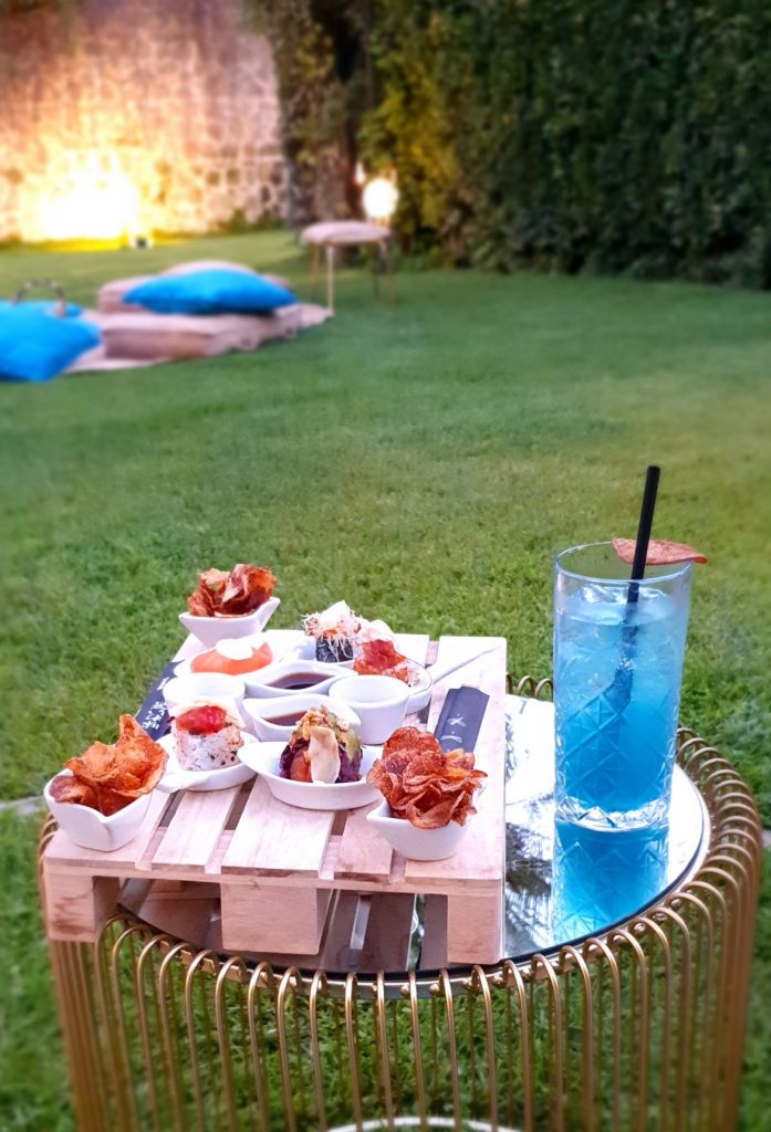 In via Ardeatina, all’altezza della Catacombe di San Callisto, sorge Villa de Cesari, una dimora storica rinomata per matrimoni ed eventi privati. Qui, all’ombra del palazzetto, in un giardino segreto circondato da piante verdi e finemente arredato con cuscini color ottanio, tappeti e igloo in legno illuminati da piccole luci sospese, è nato Luce. Si tratta di un luogo elegante ma informale, accogliente e rilassante dove accomodarsi, in totale sicurezza, per un cocktail fresco accompagnato da una vasta selezione di sfizi, focacce, fritti e piattini ricolmi di sushi.
