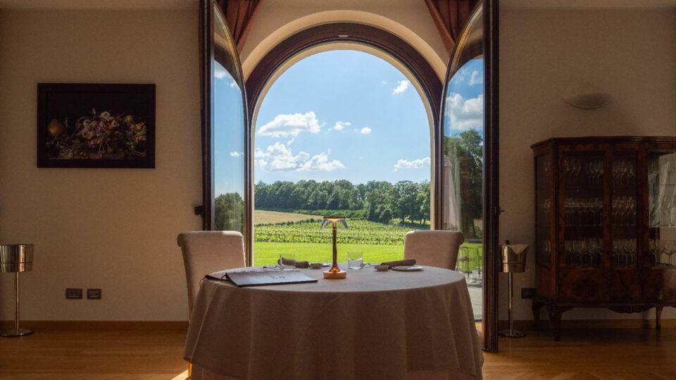 Una sala ampia e di respiro. Tavoli tondi, bel tovagliato, mobili antichi ed elementi di design. Arrivano l’entrées e il benvenuto dello Chef. Poi si sceglie tra tre alternative: À la carte, una scelta fra quattro antipasti, quattro primi, quattro secondi e quattro dessert (preceduti da un pre-dessert) o piccola pasticceria; Menù degustazione, sei portate a cura dello Chef, e Origini 20, quattro portate da materie prime in un raggio di massimo 20 km.