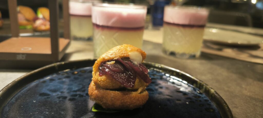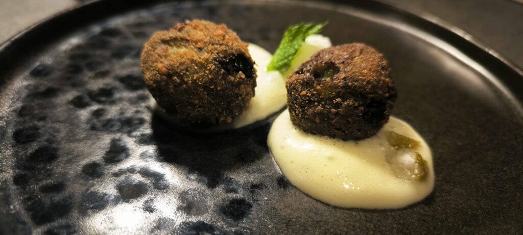 A seguire le j Polpette di broccoletto con crema di patate all’acciuga, limone candito e perle di gelato al limone e menta trovano il loro contrappunto nel Sagacia Star Martini, a base di vodka, miele di loti e salvia, rosolio al caramello, succo di lime e top di Franciacorta.