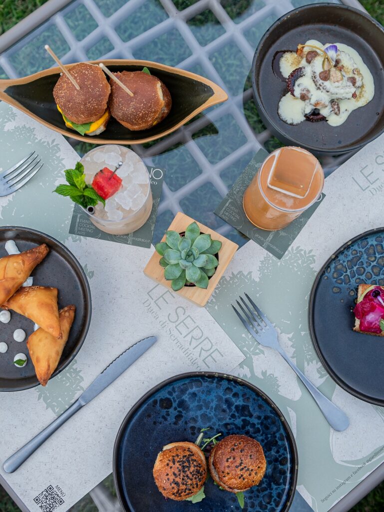 L’impronta della cucina è decisamente mediterranea, dai piatti creativi, innovativi, al passo con le stagioni che suggeriscono materie prime ed ingredienti ben precisi, per offrire piatti sempre freschi e gustosi. Tutto viene accompagnato da un’attenta selezione di vini e birre artigianali del territorio. Se si desidera intrattenersi per il prima o il dopo cena, il Lounge bar de Le Serre offre taglieri e tapas per l’aperitivo, accompagnati da cocktails ricercati e peculiari, dalla vocazione mixology, prevedendo l’uso di aromi coltivati nell’orto interno del Giardino stesso.