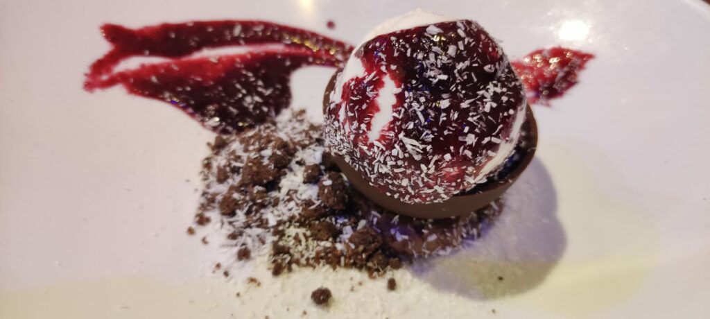Dulcis in fundo il dessert “Cocco Bello” il cui nome ricorda il mantra ripetuto sulle spiagge dai venditori ambulanti. È un vero inno all’estate con i suoi sentori di cocco resi ancora più golosi da un guscio di cioccolato fondente e da una coulisse ai frutti di bosco. Un vero tripudio di gola.
