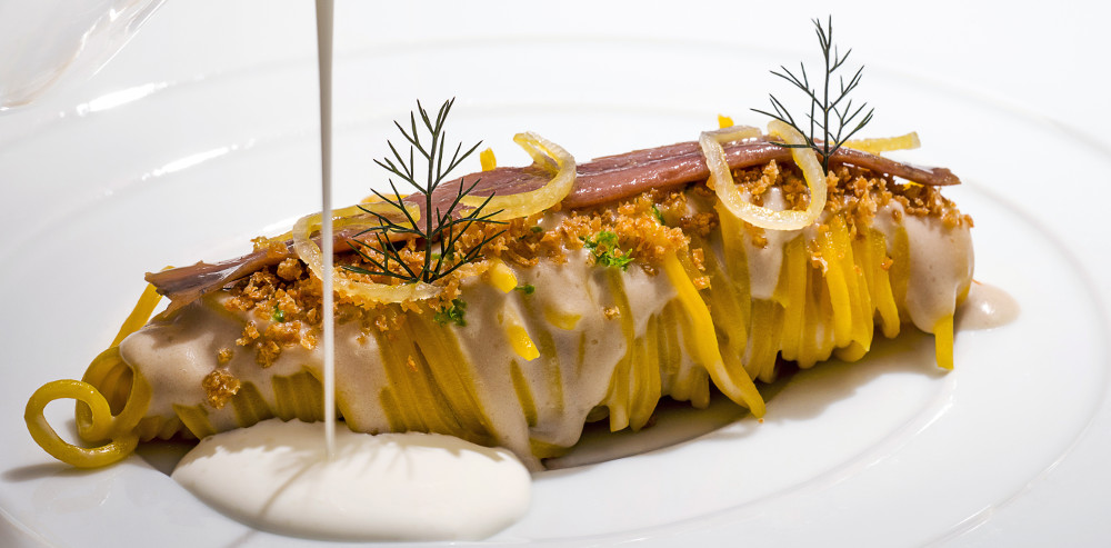 Il menù comprende interessanti abbinamenti dei vini di casa con proposte creative dello chef come gli Spaghetti al Ferrari Perlé, il Riso mantecato al Trentingrana, mele e timo, il Vitello da latte panato nei grissini, sedano rapa ai capperi e rapanelli.