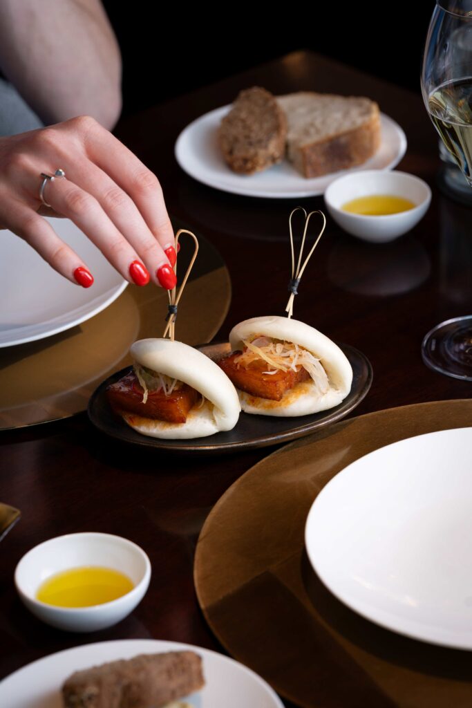 Il primo assaggio arriva come una piccola tapas elegante: un bao al vapore con maialino e radici marinate, uno dei piatti simbolo della casa. Esteticamente è quasi timido, essenziale. Poi arriva il morso e cambia tutto.