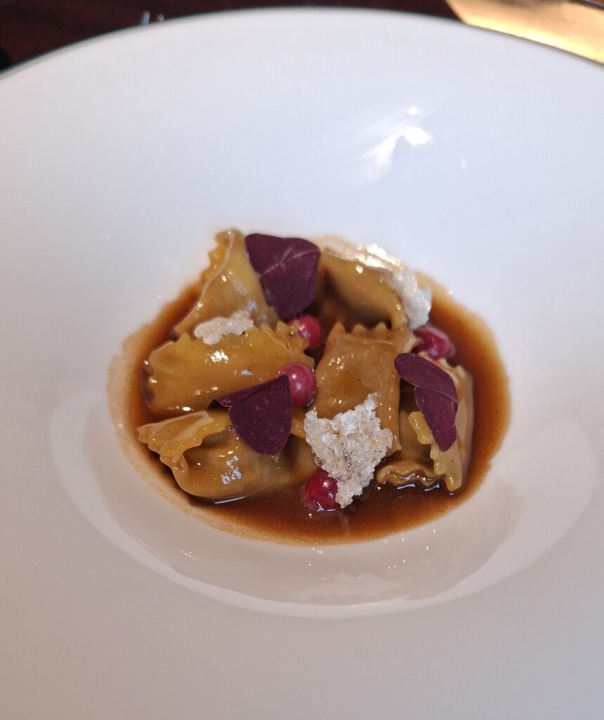 Arrivano i ravioli del plin ripieni di cintale, un piatto che racconta molto della memoria dello chef. Il formato piemontese, legato ai ricordi di famiglia, diventa il contenitore di una farcia intensa di cintale – incrocio tra Cinta Senese e cinghiale – saporita e profonda, con una nota selvatica ben controllata. I plin vengono cotti direttamente nel fondo di cintale, ricco e avvolgente, mentre la sorpresa arriva dalla croccantezza dei nervetti stracotti e soffiati. I mirtilli fermentati e le foglie di ossalide viola portano invece una freschezza quasi agrumata che alleggerisce il piatto.