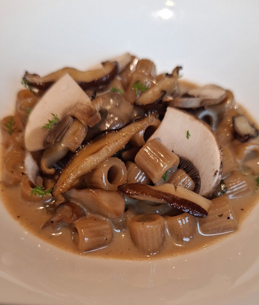 Sono i tubetti di farro monograno con funghi e fieno tostato, e colpiscono prima al naso che al palato. Il profumo è quello del bosco: terra umida, funghi, fieno caldo. La pasta viene cotta nel rilascio dei funghi e mantecata con una panna vegetale infusa nel fieno tostato, che regala una cremosità avvolgente ma mai pesante. Intorno, una variazione di shiitake, maitake e champignon crudi aggiunge consistenze diverse, mentre l’olio al timo chiude con una nota balsamica. È un piatto che non si limita a nutrire: evoca.