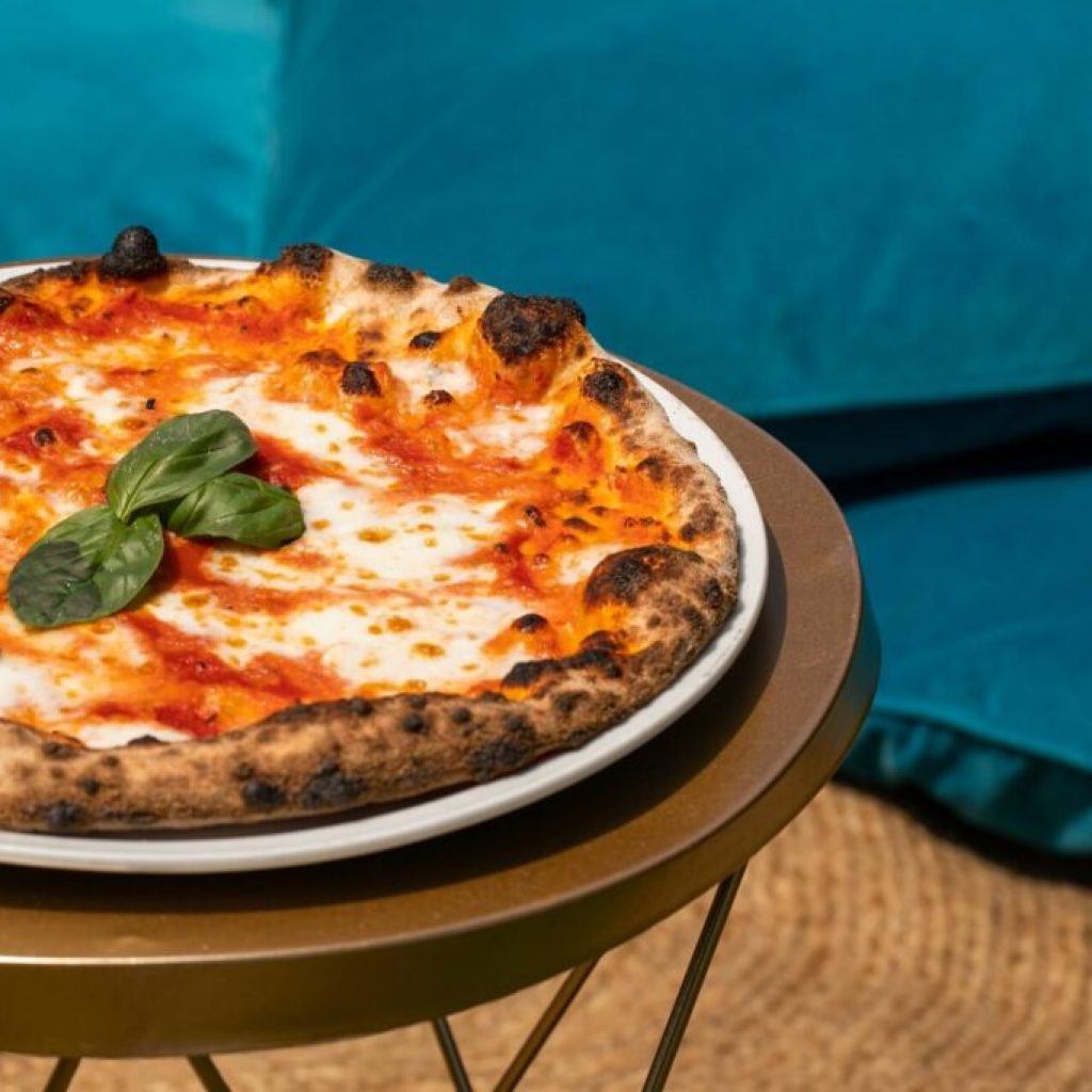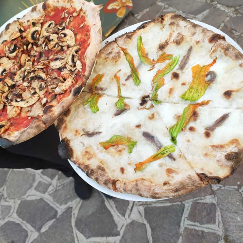 Infine c’è la pizza: morbida ma al tempo stesso fragrante, stesa a mano, molto idratata e lievitata per 48/72 ore.