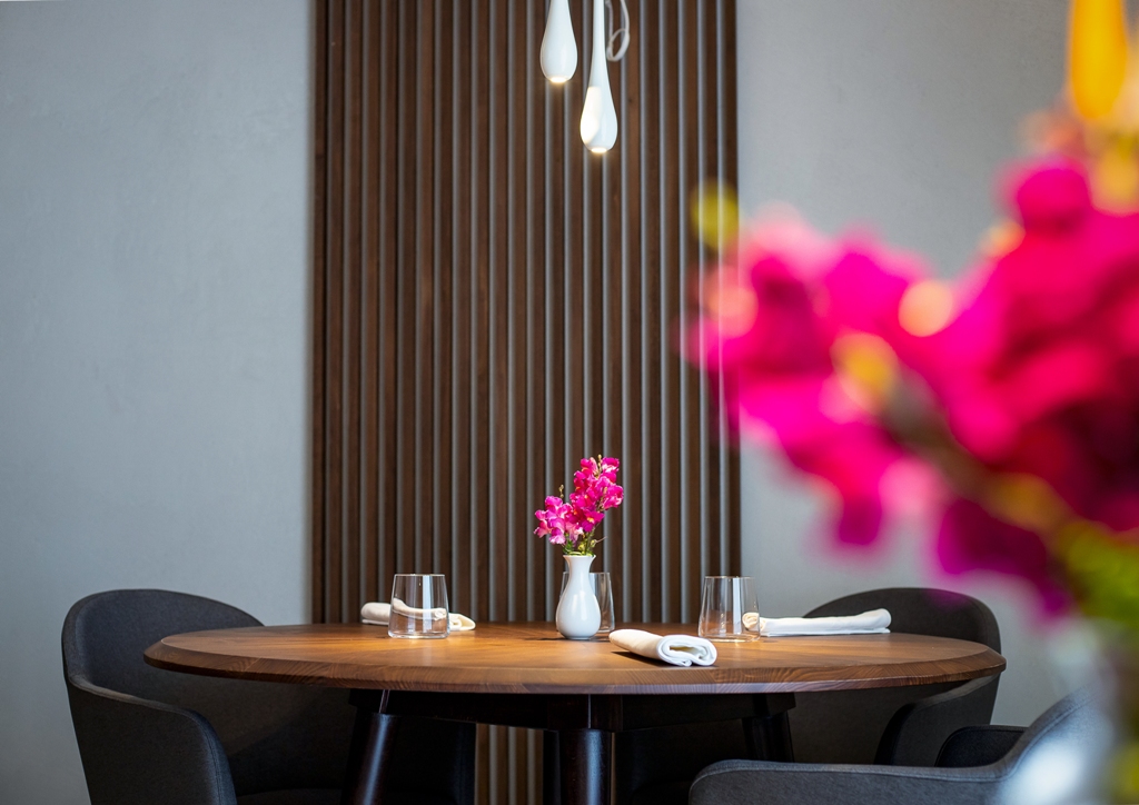 Un’eleganza minimale ci circonda, pochi coperti, il calore degli elementi in legno e dei tavoli rotondi, illuminati e senza tovaglia, si alterna alle pareti. Unico vezzo la parete specchiata, che riflette i commensali in un gioco quasi filmico, per poi scoprirsi come porta scorrevole che si apre sul regno dello chef.