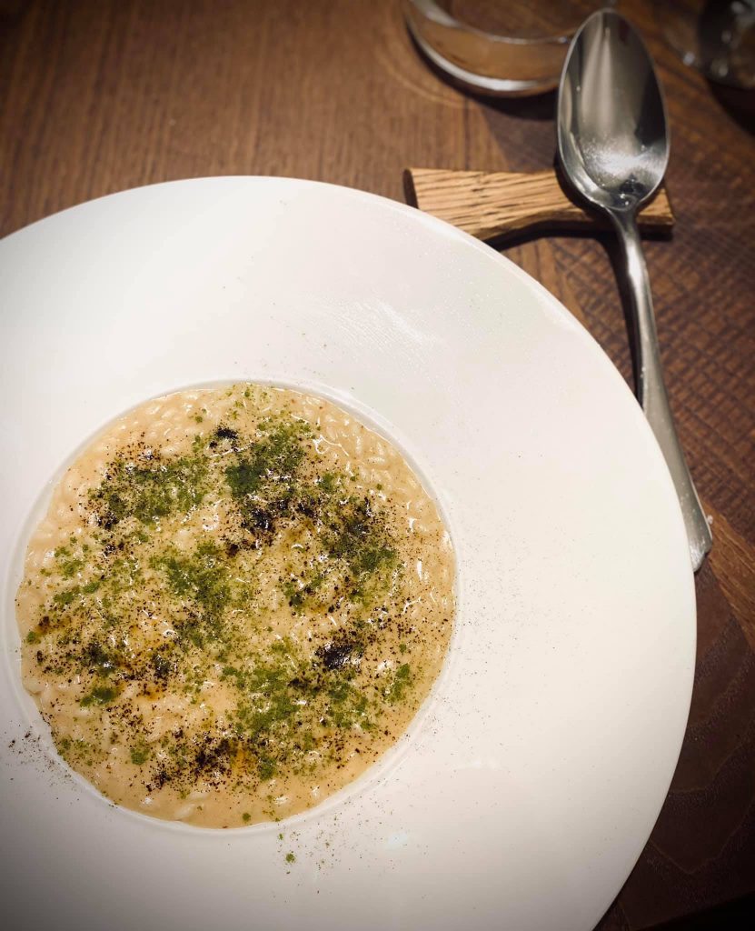 La cucina di Luigi Lepore si riconosce dai dettagli, dagli elementi di contorno come liquirizia, ginepro, alloro, arancia, che sono il carattere del piatto e la firma dello chef.  E il “Risotto al burro di ginepro, liquirizia, alloro e gin” è la sintesi perfetta del suo stile gastronomico.