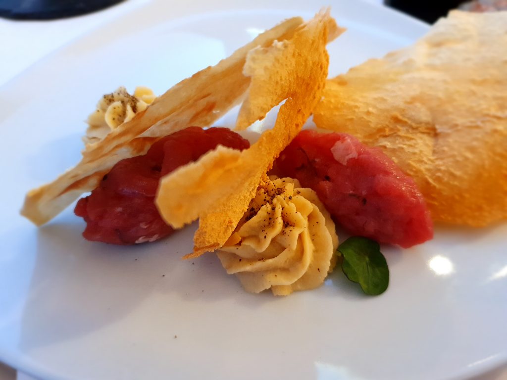 Ottime anche le due tartare: di Salome marinato agli agrumi con avocado, finocchio e panna acida all’aneto (di grande effetto anche perché servito sotto la campana e avvolto in una nuvola di fumo), e di Tonno con menta e hummus di ceci e pane Guttiau croccante.