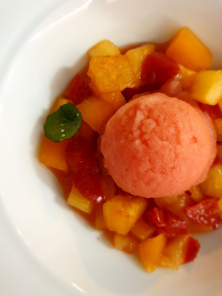 Capitolo dolci. Siamo in riva al mare, l’aria fresca accarezza la pelle dopo una giornata di caldo intenso. Cosa c’è meglio di una macedonia di frutta? Soprattutto se servita con sciroppo ai fiori di sambuco e sorbetto all’anguria. Il fine pasto ideale per rinfrescare la bocca prima di alzarsi, satolli e felici, da tavola.