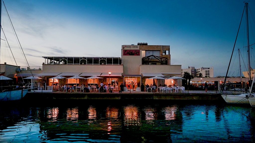 Se non ci siete ancora stati immaginatevi il salone interno di un’elegantissima nave da crociera. Focalizzate gli arredi, minimal ma raffinati. Il grande bancone bar, in rame e vetro. Le pareti bianche, le vetrate sul mare e le comode sedute in pelle. Pensate ai giochi di luci e ombre e all’inconfondibile e inebriante profumo di salsedine. Ora uscite fuori, sul pontile, e iniziate a camminare cullati dal rumore delle onde e dei gabbiani tra tavoli apparecchiati con candide tovaglie bianche.