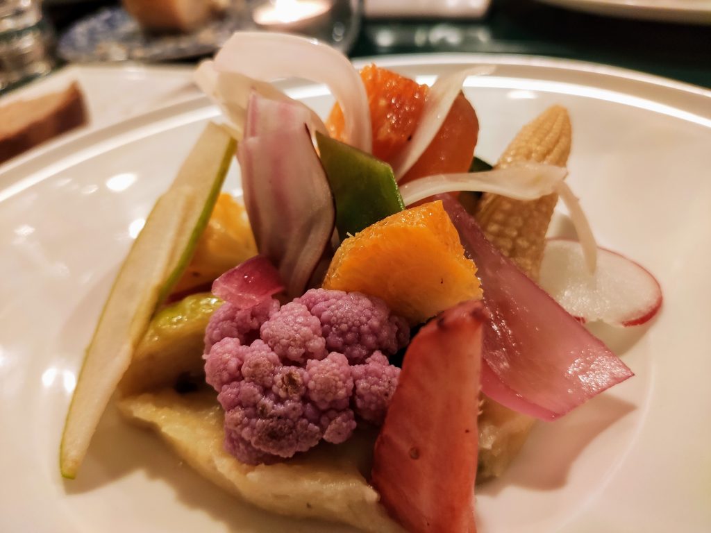Segue il Giardino invernale di ortaggi e frutta (13 euro), che è l’antipasto vero e proprio: una sorprendente insalata a base di croccantissime carote baby, cavolfiori colorati, pannocchie baby, taccole, lamponi, fragole, finocchi, cipolle rossa, rape gialle, rape bianche e ravanelli, adagiati su un saporito purè di topinambur. Gustosissimo, non smetteresti mai di mangiarlo, è un piatto che farebbe innamorare delle verdure il più radicale dei carnivori.