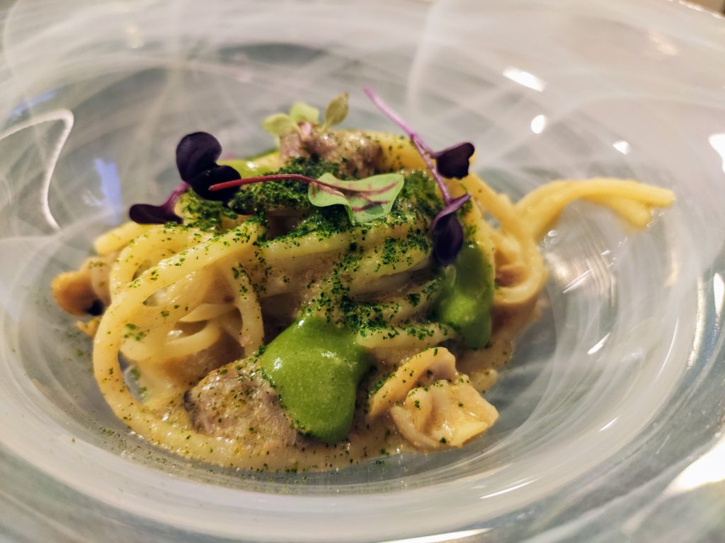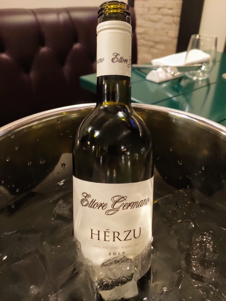 Passiamo poi ai primi con degli squisiti Spaghetti vongole, bottarga e pesto di shiso (18 euro): cotti a puntino, ben legati con il condimento che avvolgeva gli spaghetti come un guanto, sono uno dei migliori piatti della serata grazie alle vongole carnose, al giusto sprint della bottarga e al profumo dello shiso perfettamente in equilibrio. Eccellenti. Accompagniamo lo spaghetto e i piatti seguenti con una bella bottiglia di vino bianco: “Herzù” Langhe D.O.C. Riesling Renano di Ettore Germano.