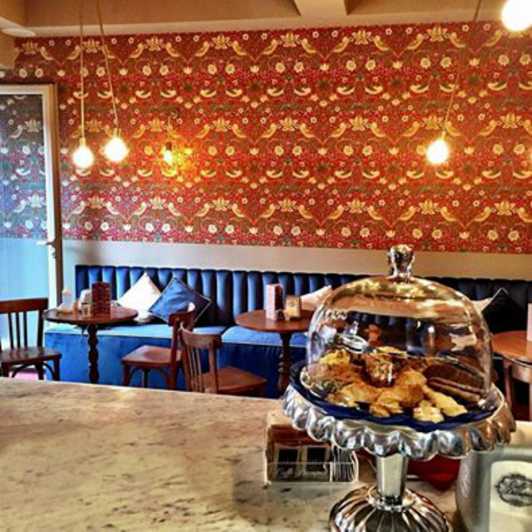 Lo stile di Magasin appunto: un po’ vintage, come lo splendido bancone in marmo bianco venato. E ricercato, anzi ricercatissimo: pavimenti a mosaico (in foto un dettaglio), pareti drappeggianti, fioreggianti, orientaleggianti. E poi, ancora, caldo: velluto blu sui divanetti, tavolini e sedie in legno noce.