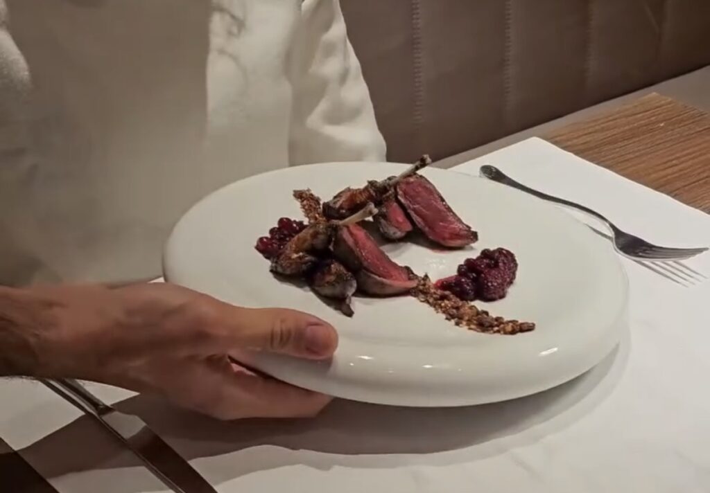 Ultima tappa a San Gemini, al Ristorante Origine, situato all’interno di un palazzo storico. L’ambiente è elegante ma non rigido, il servizio molto attento e la carta dei vini ben strutturata. La proposta è più contemporanea, con piatti che giocano su tecnica e abbinamenti ricercati. Tra gli antipasti spicca l’insalata di asparagi e gamberi con bisque di gamberi e cocco. Tra i primi, i bottoni ripieni di sode di vongole e prezzemolo sono un esempio di equilibrio e finezza. Tra i secondi, il piccione al Vin Santo con panpepato e albicocca candita è un piatto importante, intenso e perfettamente costruito.