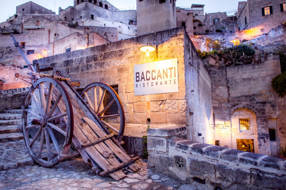 Proprio tra i Sassi, troviamo Baccanti, un ristorante elegante e suggestivo, ricavato proprio all’interno della roccia. Ai fornelli il giovane chef Domenico di Luca, realizza i suoi piatti utilizzando materie prime locali. Ed ecco dunque in menu il FIan di Caciocavallo Podolico con salsiccia pezzente (9), i Tagliolini al ragù bianco di agnello (18) e i Ravioli di pezzente con crema di fagioli (13 euro). E ancora Guancia di vitellino con vellutata di patate, bietolina e salsa all’Aglianico (22) e il Trancio di baccalà extra morro alla pignata con zucchine, patate e cipolla rossa di Matera (22).
