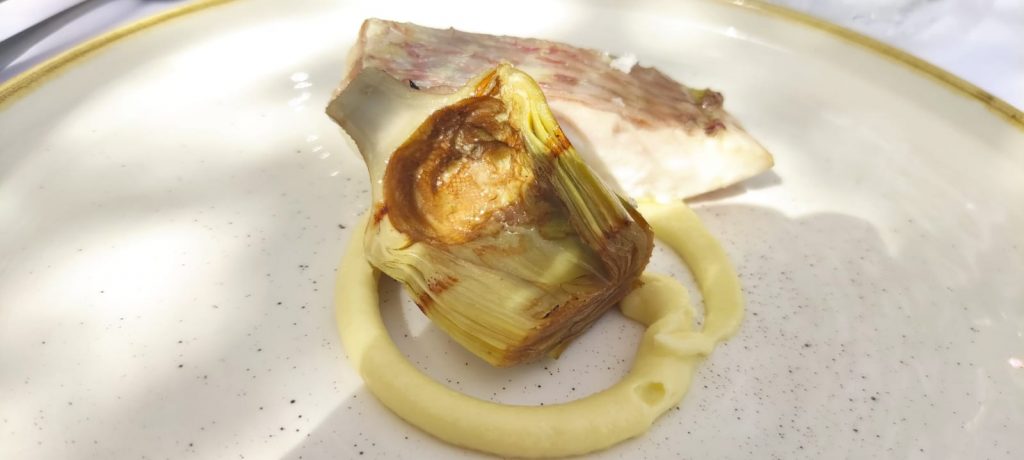 La Foresteria, wine resort della famiglia Planeta propone una cucina fondata sull’esperienza gastronomica siciliana fortemente radicata nelle tradizioni e nella storia della famiglia Planeta. Il piatto proposto in menù è “Carciofo spinoso menfitano con tartare di pesce azzurro affumicato, sarde e uova.