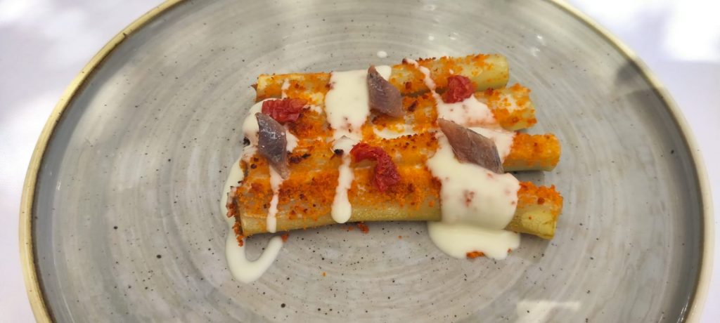 Maharia è un’esperienza unica nel suo genere che offre una proposta gastronomica con prodotti del territorio, valorizzati in chiave moderna e genuina. Qui nel menù è stato inserito un primo a base di linguine con ragù di polpo, carciofo spinoso di Menfi e granella di pistacchio.