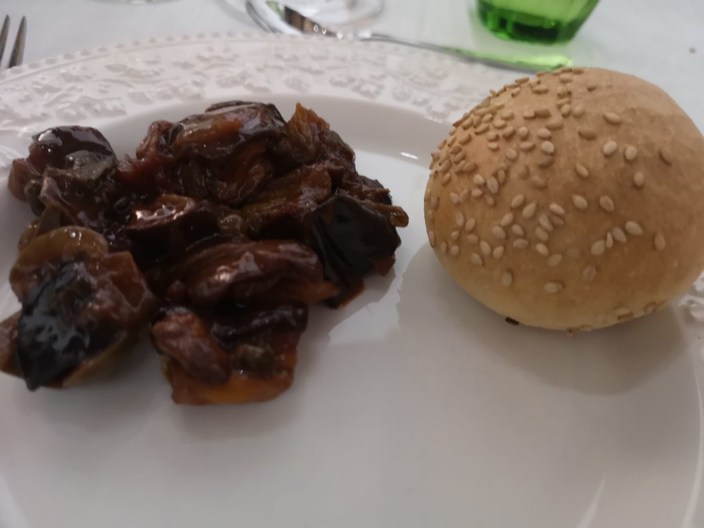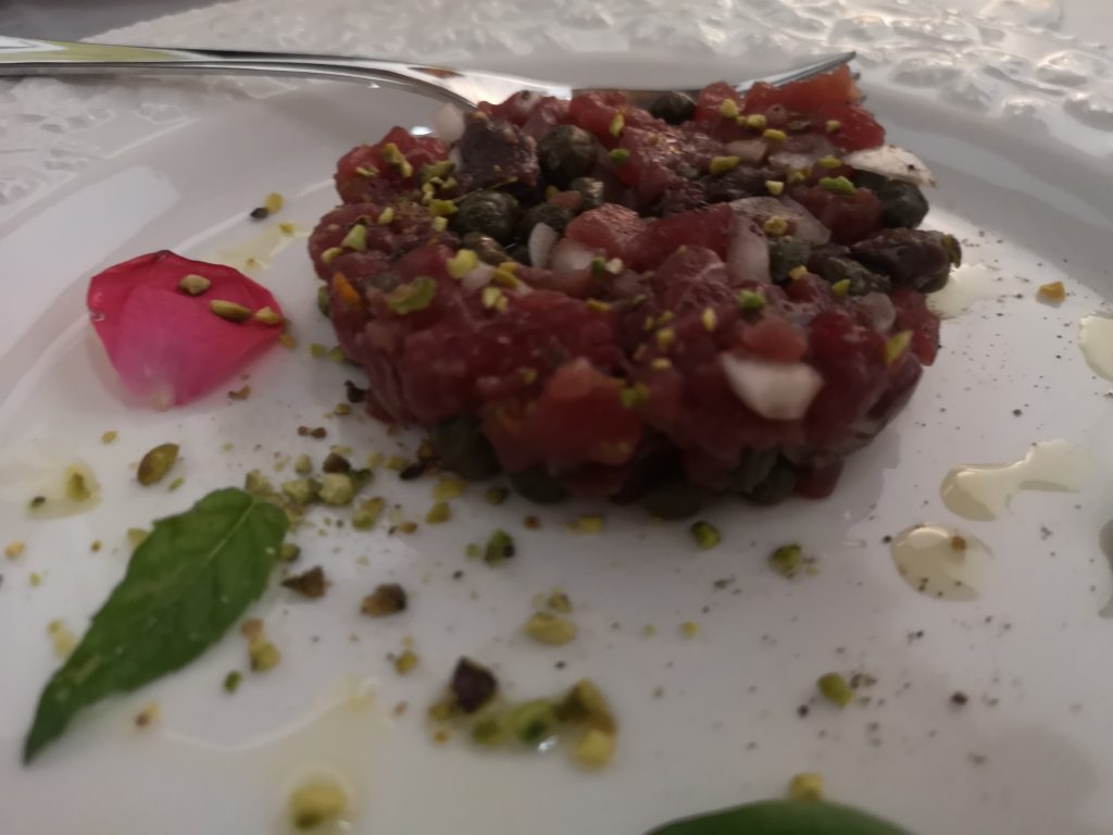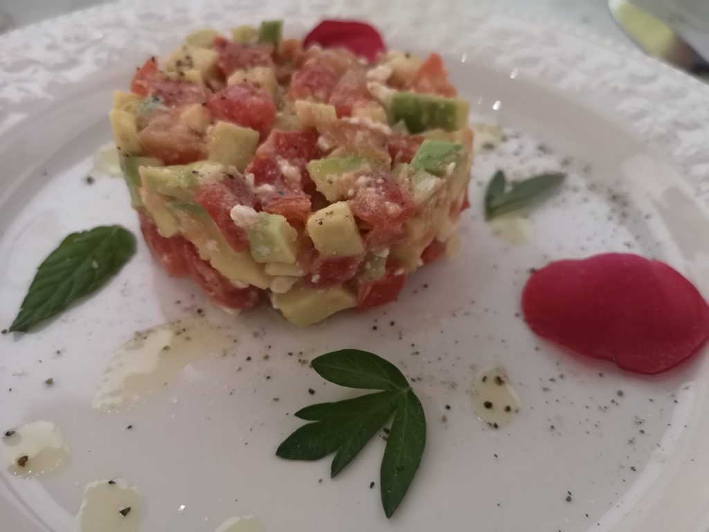Sulla tavola apparecchiata con una tovaglia il cui candore è spezzato solo da un elegante centrotavola di rose rosa, ad aprire l’antipasto una superba caponata di melanzane, must della tradizione siciliana tanto gustosa quanto difficile da preparare con il giusto dosaggio di agrodolce che, se non perfettamente equilibrato, rischia di coprire gli altri sapori compromettendone irrimediabilmente il gusto che, invece, in questo caso, è perfettamente armonico e aggraziato proprio come le sapienti mani che l’hanno preparata. A seguire tartare di tonno rosso di Porticello ai pistacchi per gli onnivori e di pomodoro, avocado e feta nell’altrettanto apprezzabile versione veg di cui, oltre che il sapore ben bilanciato si apprezza la coerenza nella proposta alternativa offerta.