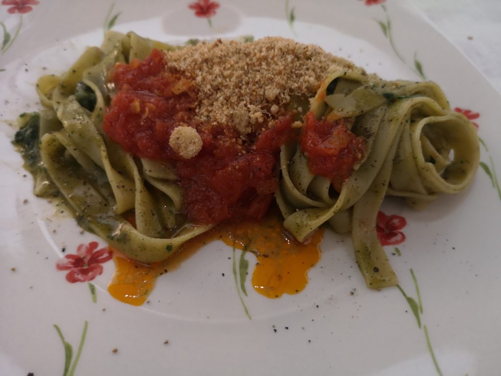 A spezzare la monocromia del tovagliato è stata, poi, la volta delle fettuccine con tenerumi alla siracusana, una raffinata versione gourmet della classica pasta con i tenerumi che, in questo caso, grazie al metodo della risottatura, alla presenza di caciocavallo e alle inconfondibili note tostate della “muddica atturrata”, ovvero abbrustolita, nota anche come “formaggio dei poveri”, diviene un piatto di grande attualità senza, tuttavia, perdere la personalità e il carattere di piatto tipico della cucina povera siciliana.