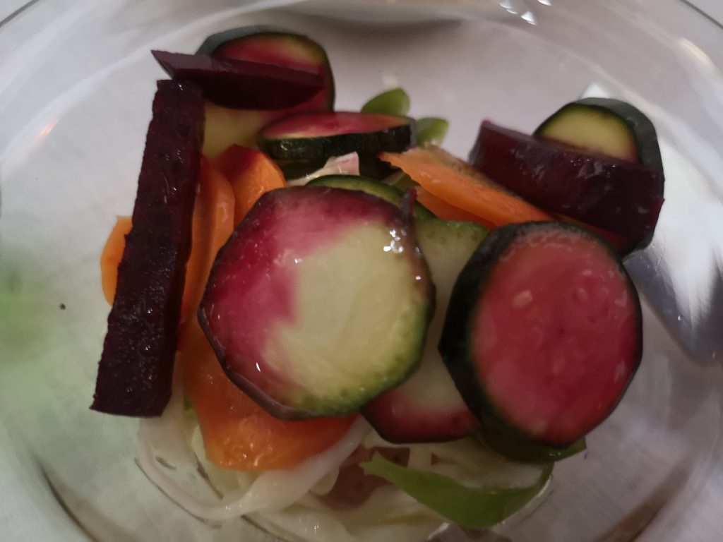 Prima di passare ai dessert per tutti delle cruditè di verdure in agrodolce macerate con uno “sciroppo” di acqua, zucchero e aceto che ne ha preservato la croccantezza regalando quella piacevole acidità che solletica il palato, pulendolo e preparandolo ad accogliere al meglio le altre leccornìe in serbo.