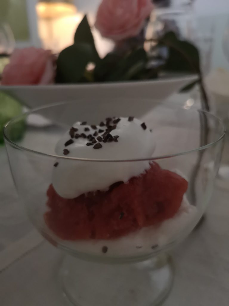 Chiude la fragolosa con panna, una granita di fragole servita con doppia panna ed impreziosita da grue di cacao, ovvero granelli irregolari di fave di cacao il cui sapore amaro e secco ha ben smorzato la dolcezza di ogni cucchiaio impedendone la stucchevolezza.