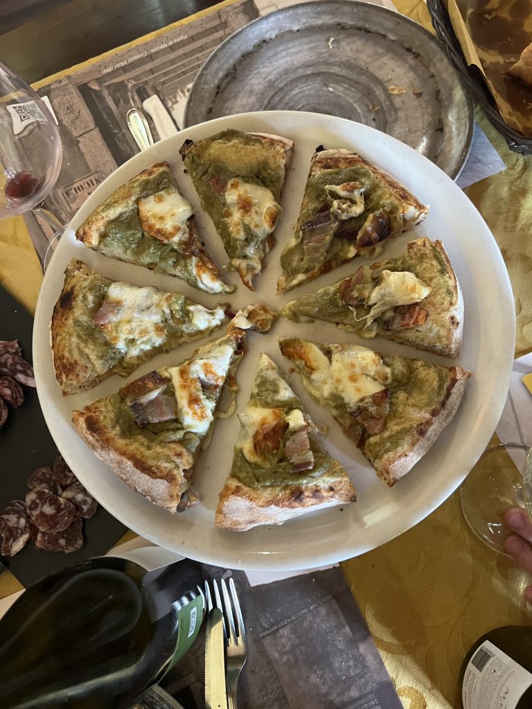 • Pizza con carciofi Mammarella, pancetta tesa, pecorino dell’Azienda Agricola Colantone, olio cultivar femminella di uliveto Castel San Martino di Solopaca.