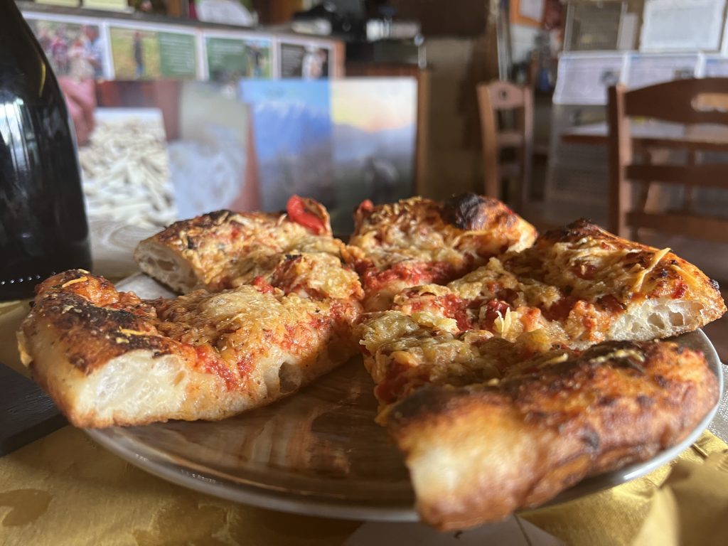 • Pizza nel ruoto con pomodoro Guardiolo a pacchetelle, origano spontaneo del Matese, olio cultivar femminella di uliveto Castel San Martino di Solopaca e pecorino dell’Azienda Agricola Colantone.