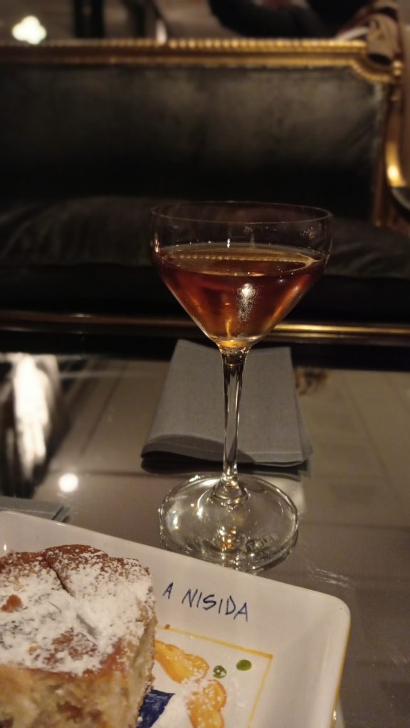 Lo chef che se ne incarica è il resident Vincenzo Fioravante. Suo anche l’assaggio dei mezzi paccheri al ragù, ammettiamolo, proverbiali per tenere a bada l’impennarsi del tasso alcolico generale. Concludiamo con la pastiera napoletana, sorseggiando una creazione di Antonio Boccia a base di Maccallan 12, Dash Maraschino ed Orange Curaçao. Confessa di averla chiamata “Nadia” (ops). Drink morbido, suadente. Profumato per tener testa alla potenza olfattiva del dolce pasquale per eccellenza. Che dire, al Bidder Bar è un gran bel sostare e noi già pregustiamo il ritorno, quando si potrà bere anche in terrazza, di fronte ad un panorama che riesce a farti innamorare ogni giorno di più.