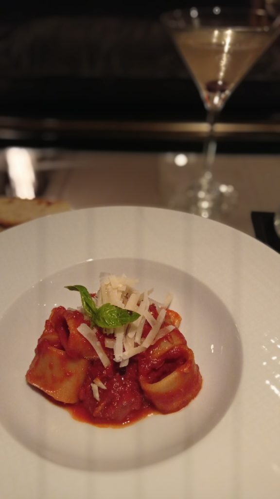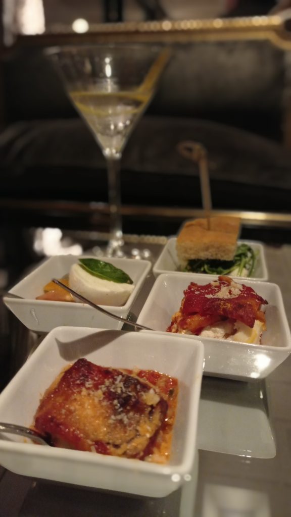 Iniziamo il viaggio con il classico dei classici, il Dry Martini, base Vodka (giapponese, per l’occasione) e Vermuth Dry. La guarnizione è un twist di limone (scorza, in questo caso, ci sembrava davvero poco british). Proseguiamo con il Vesper, base Gordon’s Gin, Vodka e Cocchi Americano, variante del cocktail Martini inventata dallo scrittore Ian Fleming nel romanzo Casino Royal del 1953. A proposito, per la serata, si può sfogliare il libro ufficiale dei cocktail dell’agente 007, si chiama “Shaken – Drinking with James Bond & Ian Fleming”. Mentre dalla cucina, dopo stuzzicanti mandorle salate, olive e tarallini, arriva un appagante excursus sulla cucina napoletana. Tutto a piccoli morsi, dalla parmigiana, all’insalata caprese, alla pasta al forno, fino alla focaccia con friarielli e mozzarella.