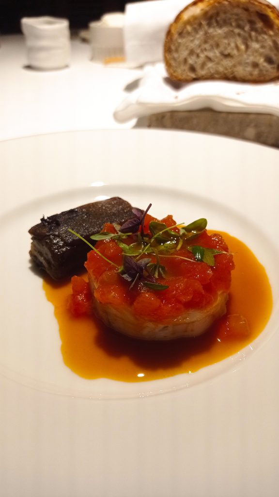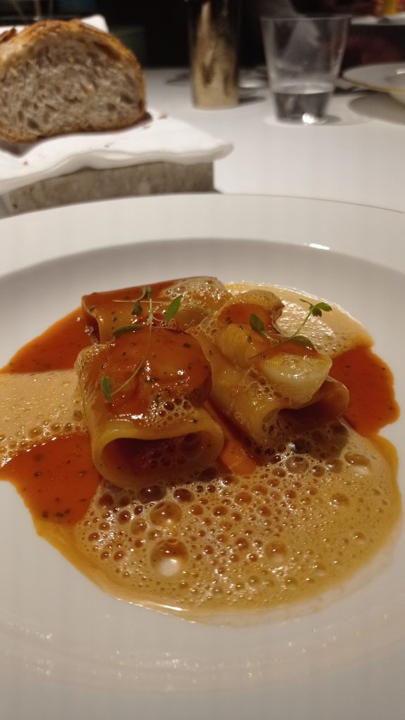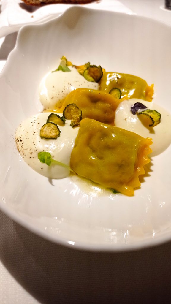 Entriamo nel pieno del menu con Polpop. Ragù di polpo con cappuccino di patate, lime, pimento e lattuga di mare. Per proseguire, poi, con un piatto simbolo della Costiera Amalfitana, la pasta alla Nerano. Qui servita sotto forma di agnolotti. Naturalmente ci sono le zucchine, il Provolone del Monaco, basilico e maggiorana.