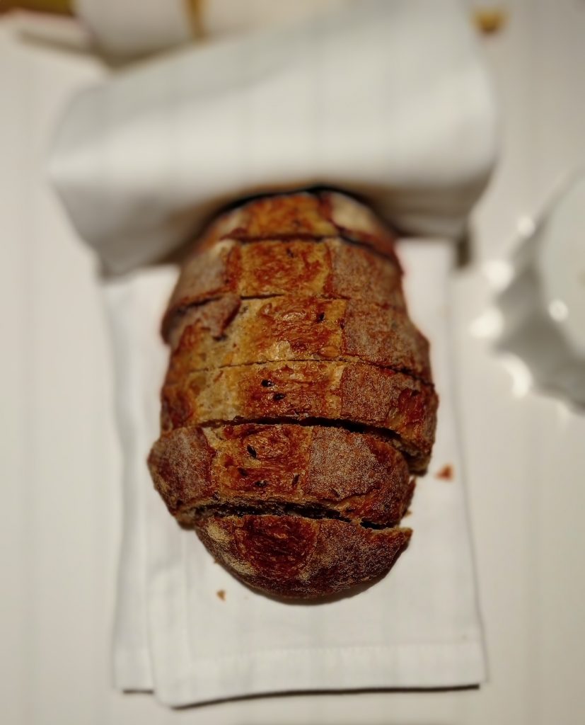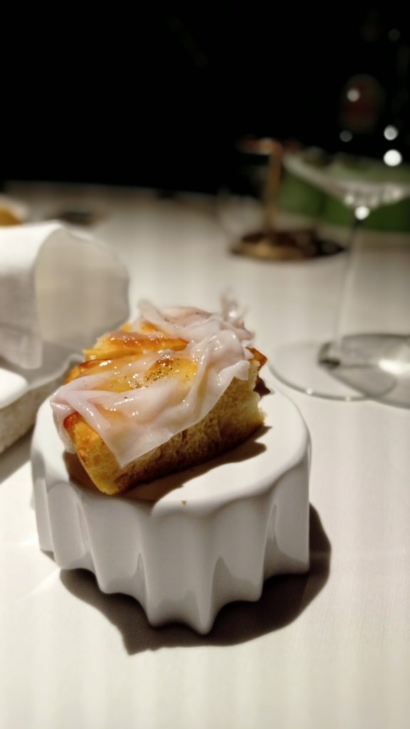 Dopo aver assaggiato olio extravergine di oliva (monocultivar Ravece) e burro da latte nobile, con grissini e pane di produzione propria, siamo già certi di trovarci nel regno di un maestro. La focaccia impastata con le patate, sofficissima, golosa, servita con lardo di maialino casertano è indimenticabile.