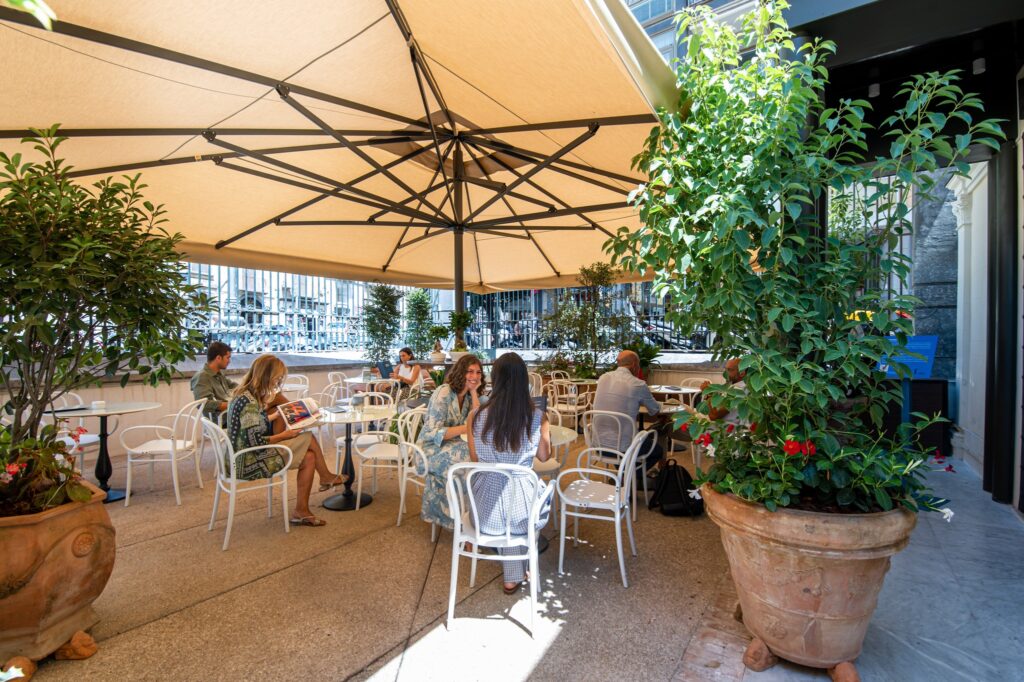 Altro punto di forza di Galleria Navarra, il bancone dedicato alla mixology. L’idea è stata quella di creare un luogo, contemporaneamente, classico e moderno. Le nuove tendenze della mixology internazionale e il classico bar all’italiana, con la coppa Martini e l’intramontabile oliva. Senza dimenticare il dehors. Il giardino di Galleria Navarra è una piccola oasi di verde in mezzo alla città. Noi ci siamo andati in un giorno feriale, a pranzo, il clima era ideale per godersi la città nel pieno della sua vitalità, stavolta in un’affascinante versione autunnale.