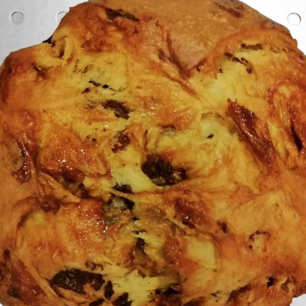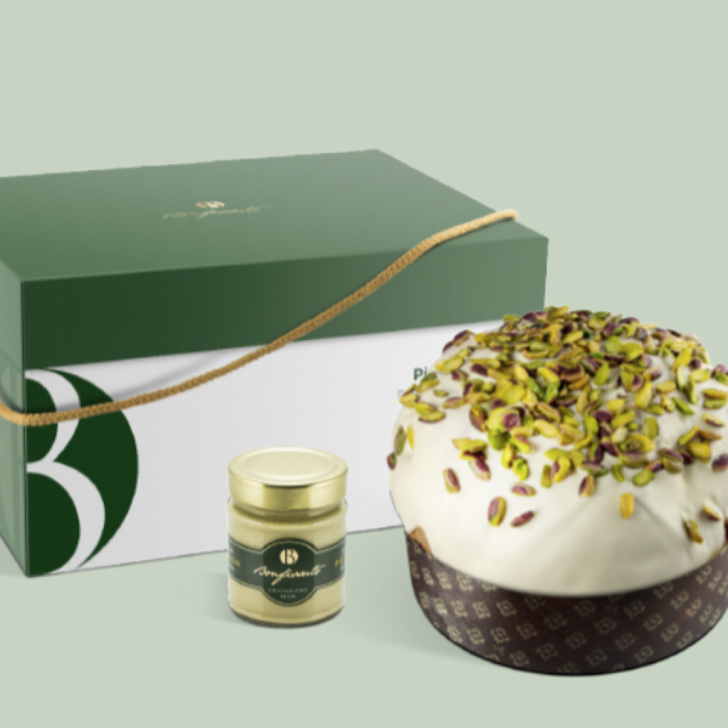 Pistacchio siciliano, Pesche e Gocce di Cioccolato per i Pupi, realizzato con lievito madre e 40 ore di lievitazione dalle maestranze pasticcere siciliane di Vincente Delicacies dove regna il principe verde, il pistacchio di Sicilia, a cui si aggiunge la pesca locale e gocce di cioccolato fondente.