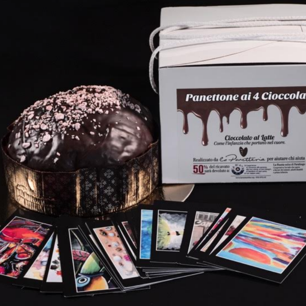 Il panettone ai 4 cioccolati è fondente, bianco, al latte e ruby, dai sentori fruttati. Ogni tipologia di cioccolato corrisponde ad una caratteristica specifica e particolare delle persone che prestano servizio e usufruiscono delle attività della cooperativa.
