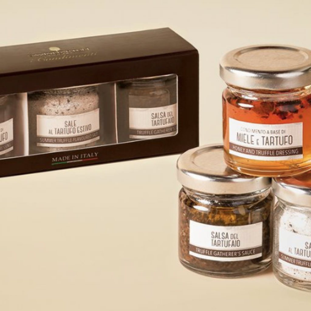 La confezione contiene la classica e versatile Salsa del Tartufaio, il Sale al Tartufo ed il Miele e Tartufo.