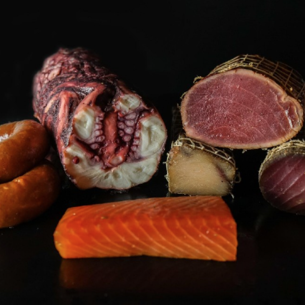 I Salumi di Pesce toscani impreziositi da sali, aromi, note di fumo di ulivo e di melo tipiche della regione. Bresaola di tonno rosso, Roastfish, Lonzino di pesce spada affumicato.
