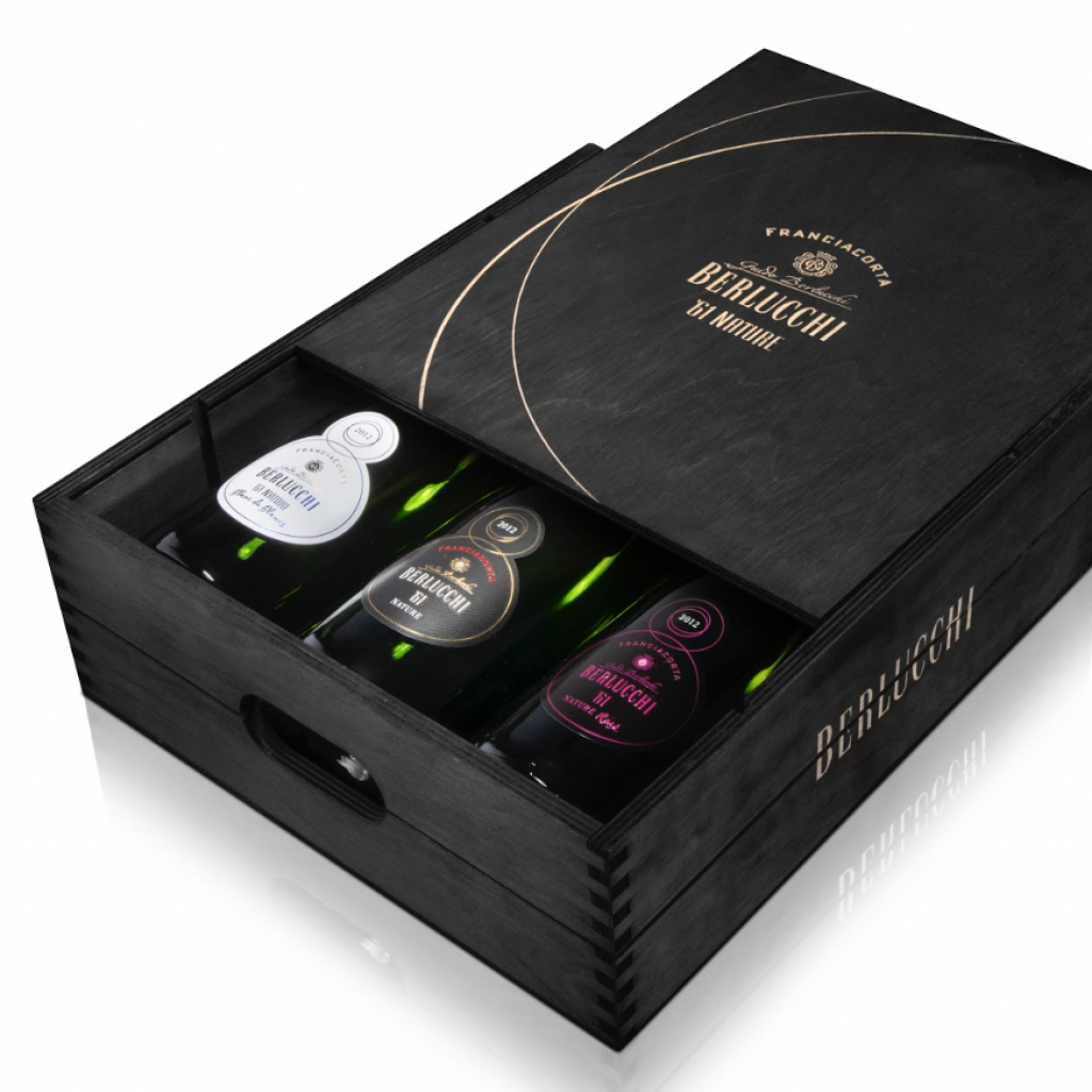 Tra le proposte da non perdere, la Magnum Berlucchi ’61 Brut che cambia veste e si tinge interamente di rosso per le feste in questo pregiato formato, per celebrare in grande. Bellissimo anche il Cofanetto in legno Berlucchi ’61 Nature Millesimato, dove troviamo racchiusa l’anima più pura del Franciacorta con i suoi tre prodotti millesimati e senza dosaggio, dall’impronta inconfondibile ed esuberante: Berlucchi ’61 Franciacorta Nature 2013 (70% Chardonnay e 30% Pinot Nero), il pluri