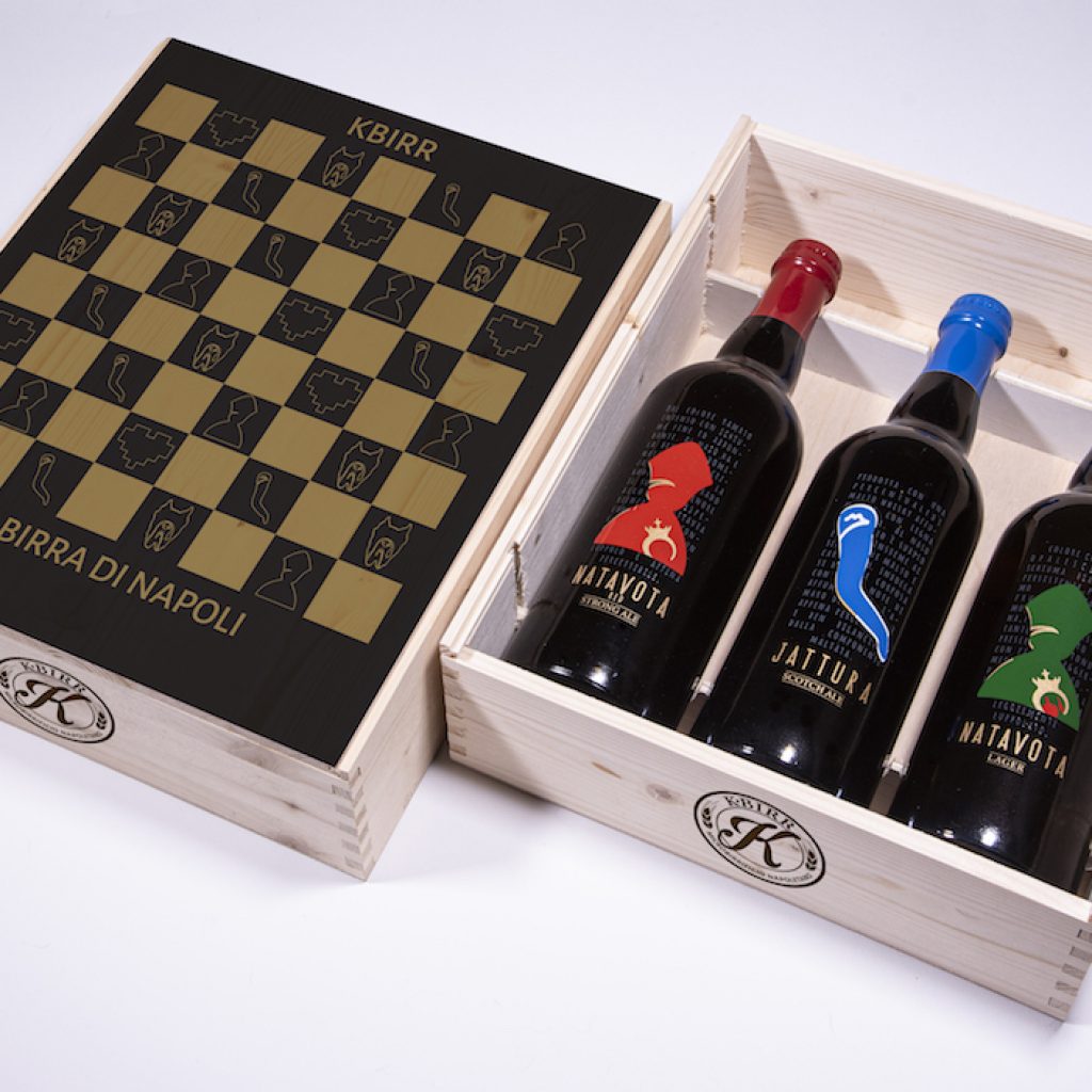 Ricordano una scacchiera le confezioni di Natale in legno di Kbirr, la birra artigianale e non pastorizzata prodotta interamente in Campania. Le tipologie sono sei, Lager, Scotch Ale, Imperial Stout, Red Strong Ale, American Pale Ale e Golden Ale, per soddisfare ogni gusto e stile.