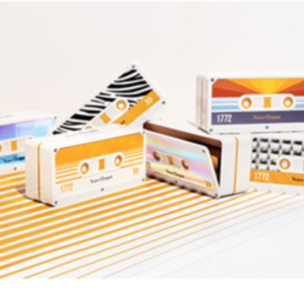 della Maison per ciò che di bello ci circonda. E cosa può esserci di più “rétro chic” di una musicassetta? L’iconico ritorno agli anni ‘70 e ‘80 ha ispirato il nuovo universo Clicquot Tape, una collezione di sei cofanetti in metallo dal design rétro, audaci e accattivanti, un